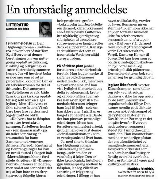 Reaktion auf Tom Egil Hvervens Kritik zu Leif Høghaugs Kælven (Klassekampen, norwegisch)